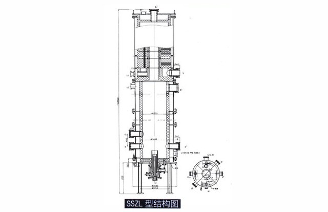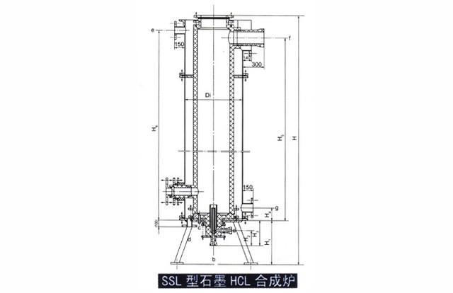 SSL型石墨氯化氫合成爐由爐底點火裝置,爐筒及鋼制冷卻套 組成,集氯化氫合成與冷卻二功能于一體,其突出優點是:一、產品 不受污染,純度高;二、生產能力大且調節范圍大:三、使用壽命長 (操作正常時其壽命可達十年以上);四、生產現場流程更簡化.勞 動條件好且控制。管理方便。圖示為氯化氫合成爐結構圖。技術特性:爐內 水夾套設計壓力Mpa 0.06 常壓設計溫度℃ ≤350℃ ≤100技術標